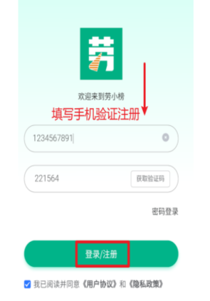 1.填写手机号,点击获取验证码,点击登录/注册。
