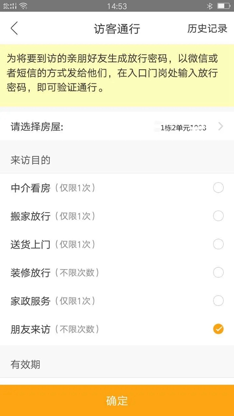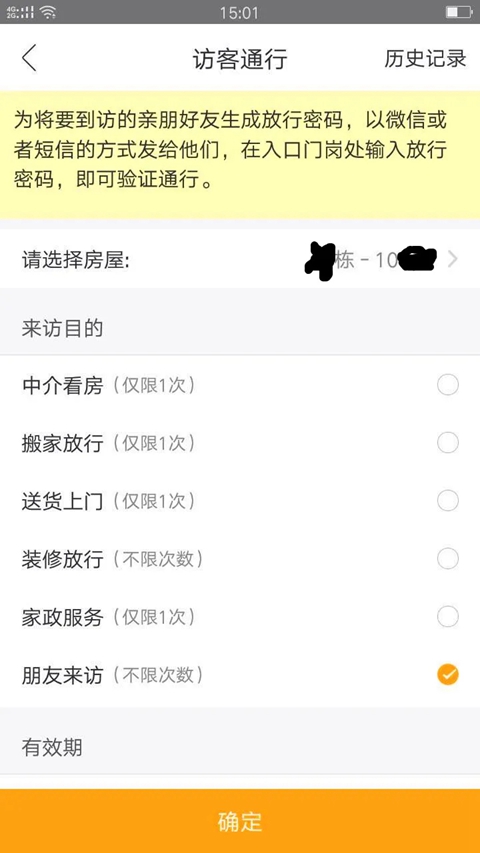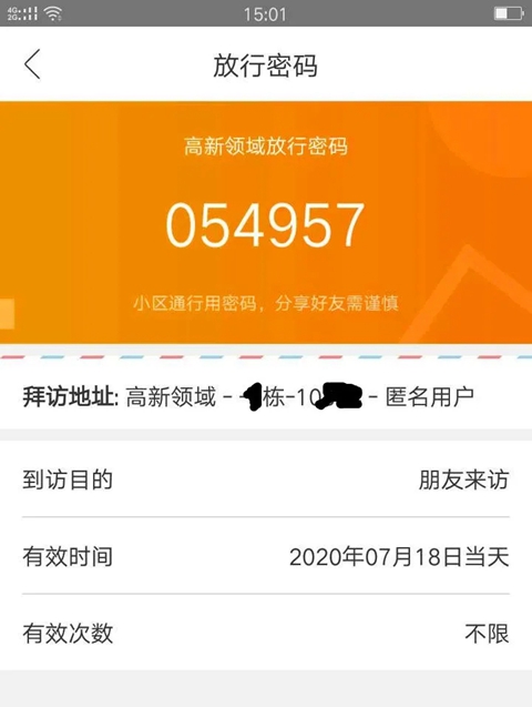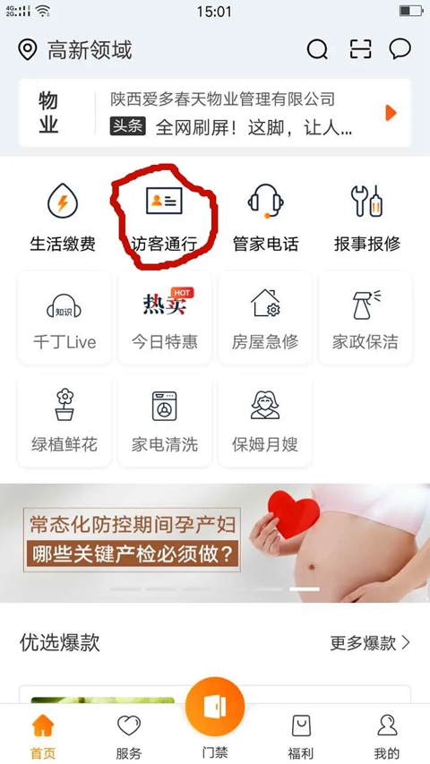 3、最主要还有一个功能家里来人不用下楼去接静静地坐在家里等待客人进门。只要用手机打开千丁在首页点击【访客通行】选择来访目的即可生成一个密码将密码发给来访人员即可进入步骤如下: