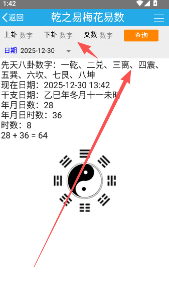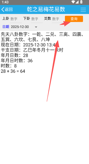 2、点击输入上卦下卦数字,爻数以及日期的选定,开始梅花易排盘操作。