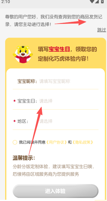 2、来到宝宝资料填写部分,填写完整可获得额外奖励,如果不需要的话,就请点击右上方的跳过。