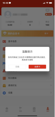 用户通过上述方式注册、入会操作完成后,可以点击个人中心页面的绑卡按钮,绑定工会会员卡