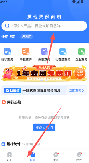 3、搜索,会员展示部分,快速搜索发现更多商机,输入公司名称、项目查询中标结果,都在这里操作。
