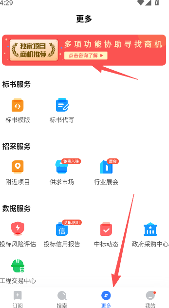 4、更多,多功能协助查找商机,提供标书服务、招采服务、数据服务等多个方面的线上内容,有关招标的一切,这里都有。