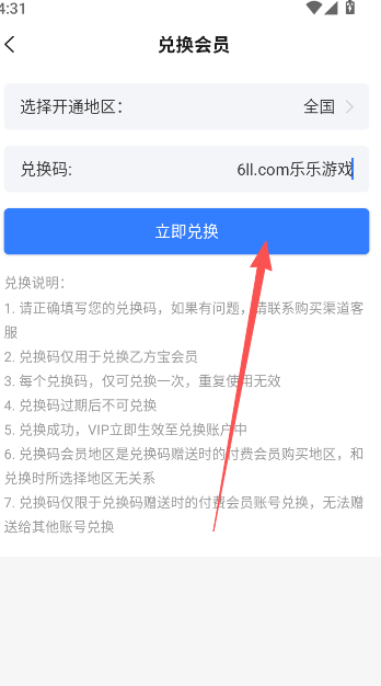 2、选择会员开通地区所在地,并输入兑换码内容,完成后点击立即兑换。