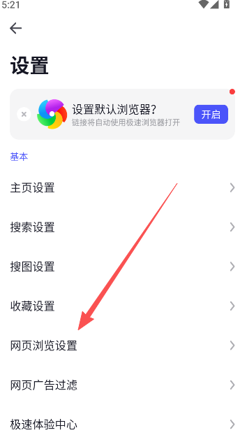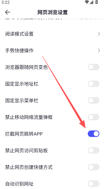 3、在网页浏览设置中,点击图标关闭拦截网页跳转APP选项就行了。