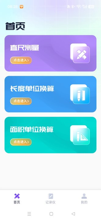 1、启动软件进入,点击首页可以看到软件测量功能主要分为直尺测量、长度单位换算和面积单位换算三种。