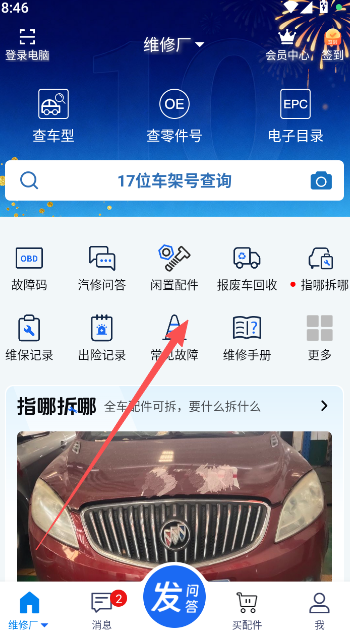 3、在维修厂界面,了解汽修服务相关事项办理,包括故障码、汽修问答、闲置配件以及报废车回收等服务的查询。