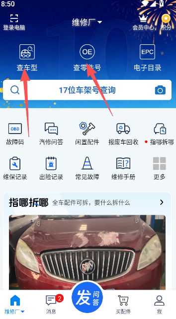 1、汽修宝车辆信息查询,主要集中在首页版块,可点击查车型、查零件号来获晓。