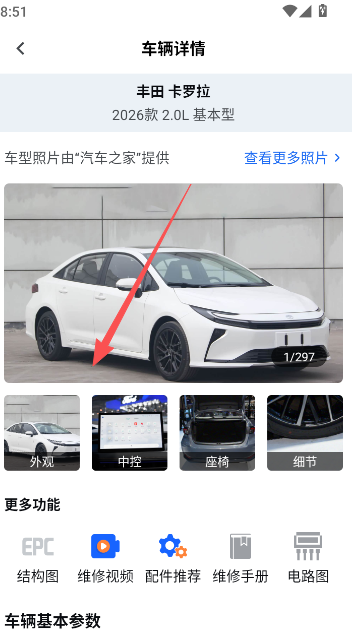 3、最终车辆详情结果如下,如果想要查看更多,可以点击更多功能获取车辆基本参数内容。