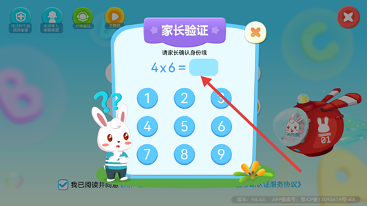 2、打开兔小贝abc进入家长验证环节,界面弹出紫色家长验证框提示请家长确认身份,输入用户个人手机号码短信验证码信息后进入。