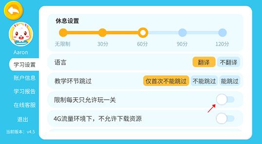 2、各位家长用户们通过验证是本人身份操作以后,在学习设置界面点击“限制每天只玩一关”右侧的开关即可开启。