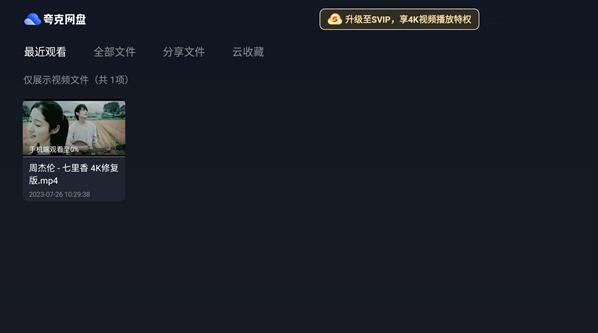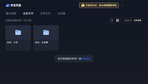 2、进入默认显示全部文件夹,但是能看到的只有视频文件,其他文件会被屏蔽,最上方是夸克网盘名称然后,下面最近观看、全部文件、分享文件和云收藏。