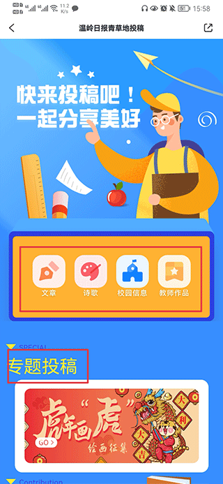二、选择投稿文章、诗歌、校园信息、或者专题投稿