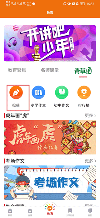 一、打开掌上温岭app,在教育界面中的青草地中点击投稿