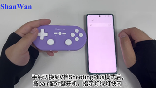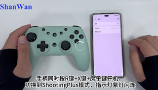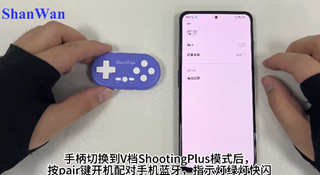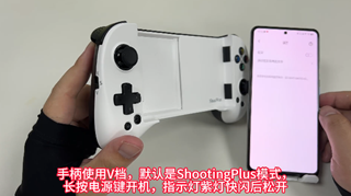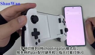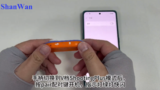 切换到V档ShootingPlus模式,按手柄底部的pair键开机,指示灯绿灯快闪。