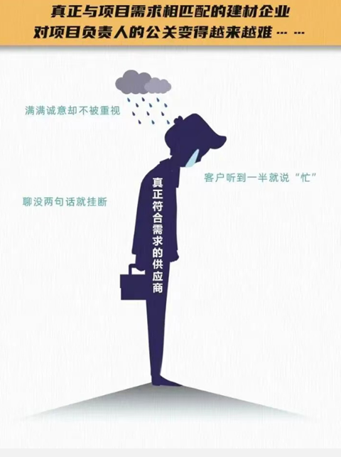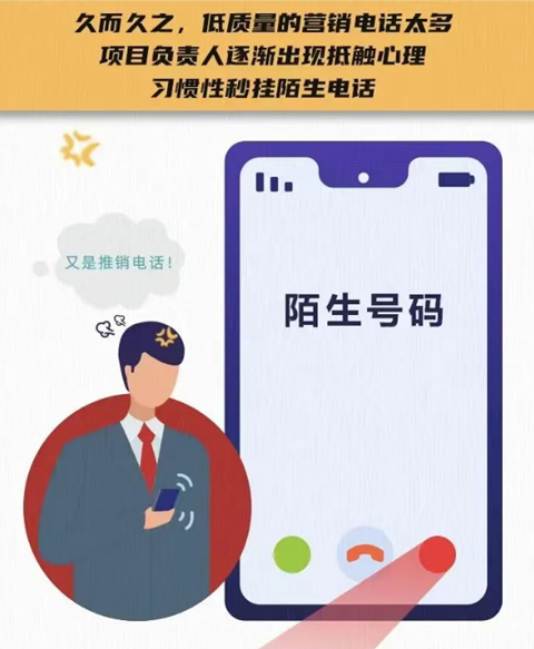 大部分销售企业会根据产品的特点和定位筛选出相对匹配的项目进行跟进,但也有些企业的业务人员在未经分析的情况下,大范围盲扫项目,有时候还会出现同一个公司里面不同的业务人员反复多次联系同一个项目负责人的情况;还有一些销售人员甚至会把项目负责人的电话发到朋友群里,导致该负责人短时间内疲于接听大量电话。这些问题会给项目负责人造成一定程度的骚扰,导致他们对陌生号码习惯性挂断;同时,对于那些真正能够匹配项目需求的建材企业,项目跟进难度也大幅增加。