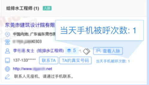 了解客户当天被其它材料企业联系的频率,如果客户当天被频繁联系,可以再择适合时间联系,减少挂断率。此外,如果出现某供应商的销售人员被同一个项目联系人多次快速挂断的情况,系统会在一定时间内自动阻断该公司对该联系人的联系,从而有效保障其他公司联系该项目时的通话质量。
