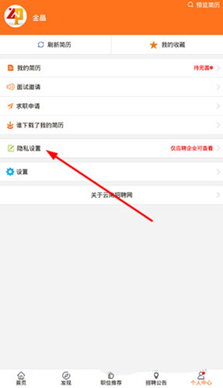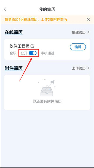 3、然后点击简历卡片上的【开关】按钮,即可将公开状态切换为隐藏状态。