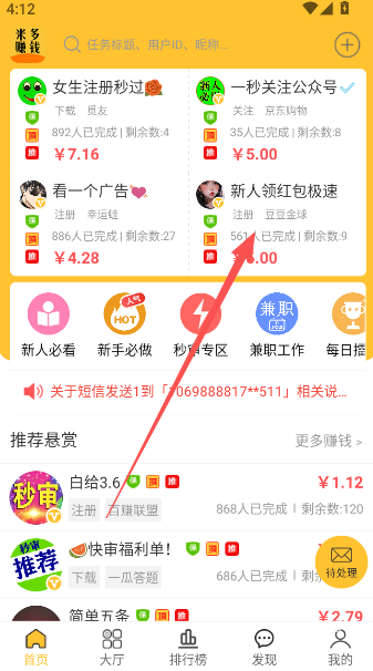 1、米多赚钱极速版和米多赚钱普通版所使用的账号是一样的,登录的时候直接用之前的就行,登录完以后在首页选择一个你觉得不错的任务参与。