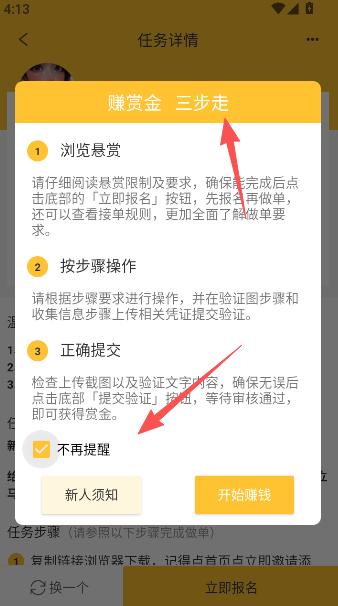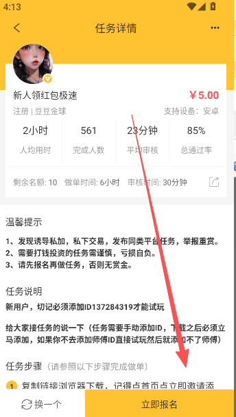 3、查看下方任务提示和赚钱步骤的图文说明,点击立即报名。