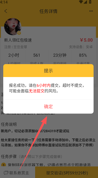 4、之后会有报名成功的提示,耐心等待任务发布者与你联系安排即可。