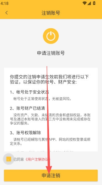 3、勾选下方的用户注销协议部分,点击申请注销,注销完以后,账号以往保存的记录内容将不复存在。