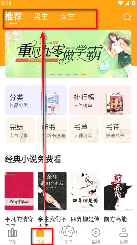 8.点击下方的书城,可以看到分为推荐、男生、女生三大板块内容,每一个板块都会有详细分类的小说资源哈。