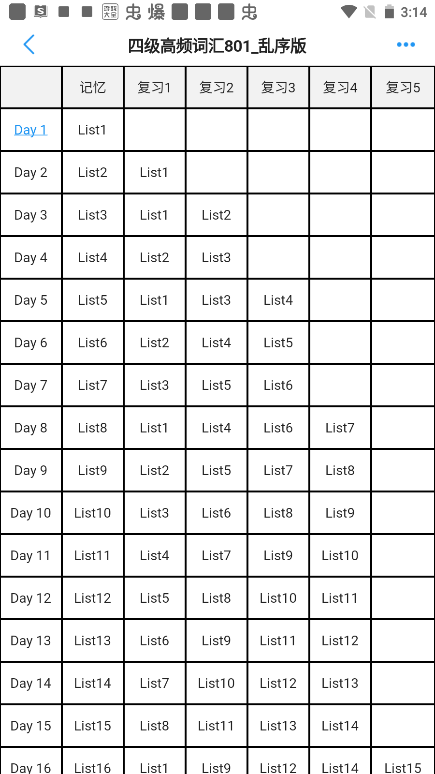 答:每个Day的学习由`记忆`和`复习`两部分组成,Day2里有List2记忆和List1复习,两个都完成`打卡`,顶部的向右箭头就可以点击,切换到Day3。