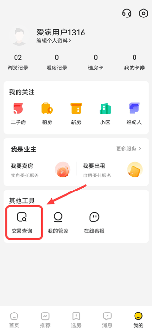 1、使用签合同时留下的手机号注册登录我家官方app,同样是在我的界面点击【交易查询】