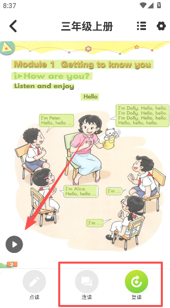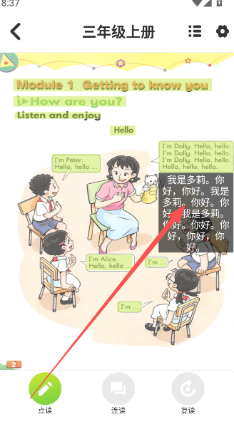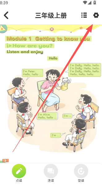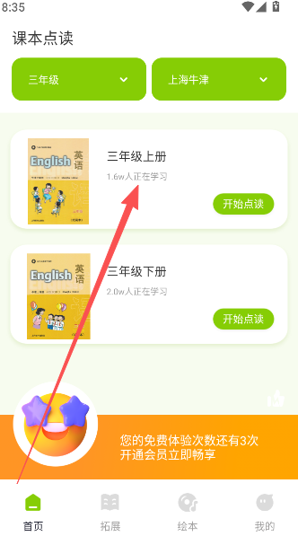 1、下载软件启动进入,点击首页上方选择所在年级和教材,开始点读。