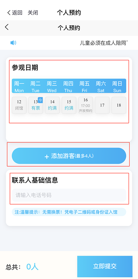 6、选择参观日期,添加游客,填写联系人基础信息后提交即可。