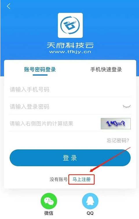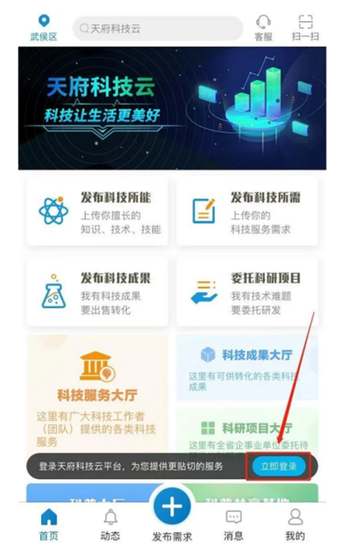 一、打开天府科技云APP点击下方的“立即登录”按钮即可进入登录/注册界面。