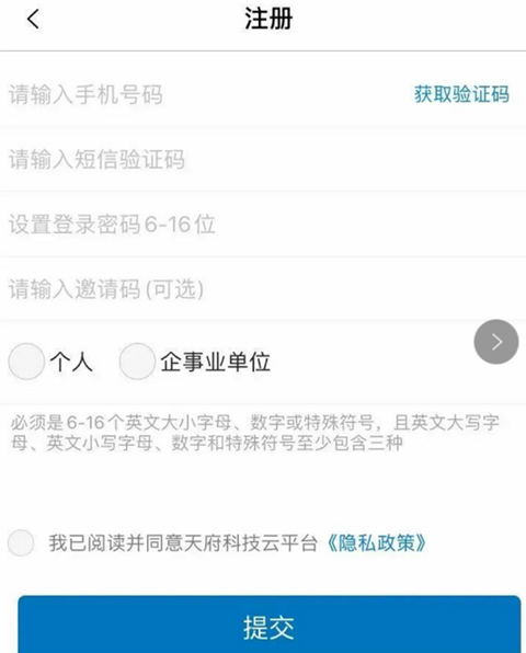 三、填写手机号码,获取验证码,设置自己的密码,选择自己的账户类型(注册类型选择:个人),点击提交即可注册成功。