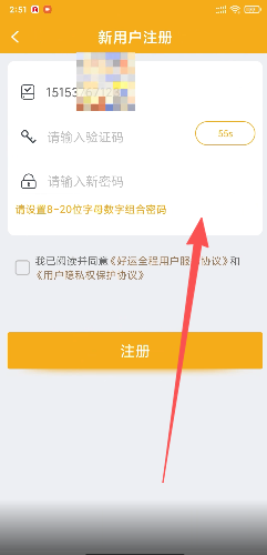 2、在新用户身份注册界面,输入手机号码短信信息进行注册。
