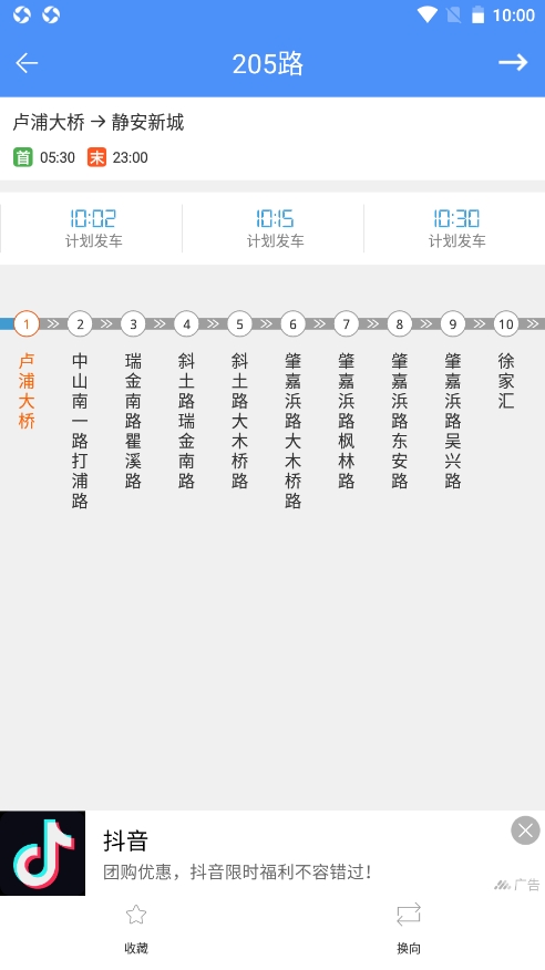 2、比如说205路,可以查看此路公交车所经过的站点以及发车时间;如果是经常乘坐此路公交车的话,可以点击下方的【收藏】;点击【换向】则可以查看静安新城到卢浦大桥的发车时间;