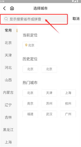 1、启动应用后,在城市选择页通过搜索或拼音输入定位意向城市。