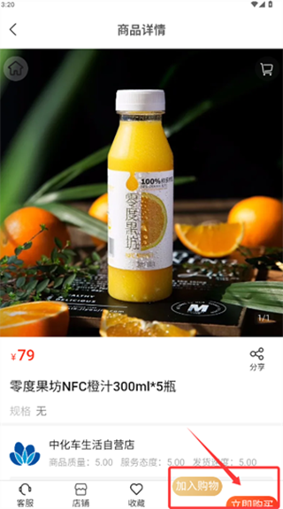 3、选定商品后进入详情界面,可点击加入购物车或直接购买下单。