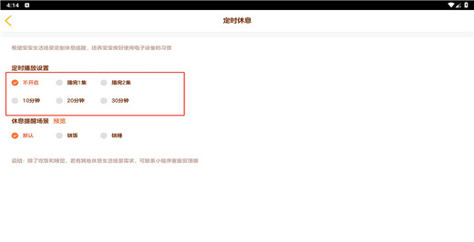 3、根据自己的需求选择定时播放设置,休息提醒场景。