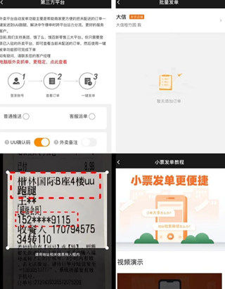 小票发单:可拍摄小票上的地址及电话信息发布订单;左上角问号可查看小票发单教程视频及详细说明;