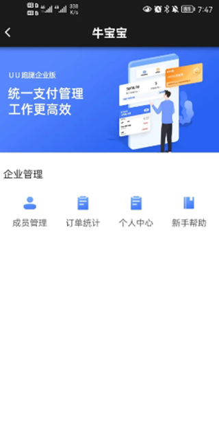 企业管理包含成员管理,订单统计,个人中心,新手帮助四个部分;