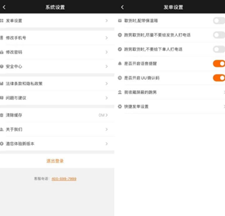 进入后可查询系统设置的相关功能,如修改发单设置、手机号、修改密码、查询已收藏或屏蔽的跑男;