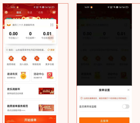 1.播报: 显示实时播报的订单弹窗,点击下方的“开始接单”,选择是否携带保温箱(灰色代表未携带),点击 “去接单” 即可开始接单。(若城市开启健康上报,需要填写健康上报)