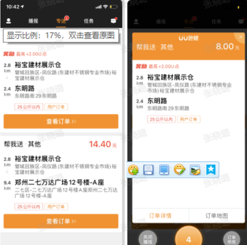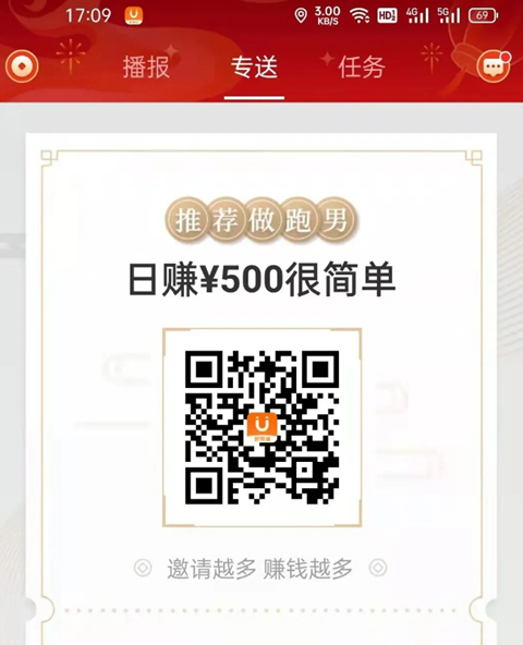 2. 专送: 显示跑男可选择配送的订单,订单实时播报无人接单时会出现在此列表;若当前没有可选择配送的订单,该页面会显示推荐跑男及用户的推荐二维码。