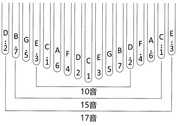 通过观察图片我们可以发现,17音囊括了15音跟10音的音域,15音囊括了 10音的音域。也就算说只要是15音跟10音可以弹的谱子,17音都可以弹。只要谱子里面没有出现倍高音2跟倍高音3, 15音的琴都可以弹。而10音琴可以弹的谱子就很少了,10音琴一般可以用在弹唱上。建议大家买15音跟17音的琴,当然最好是17音的。谱子目录会给出曲子适合的音域范围。