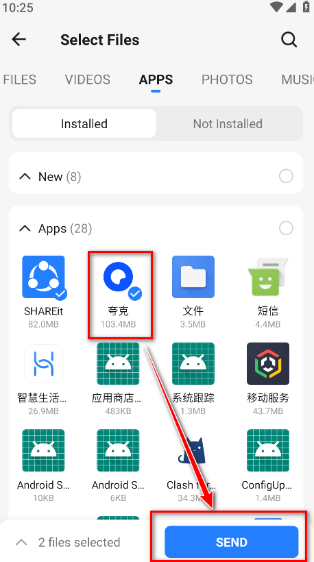 选择要发送的文件类型(如图片、视频、应用等),勾选具体内容。