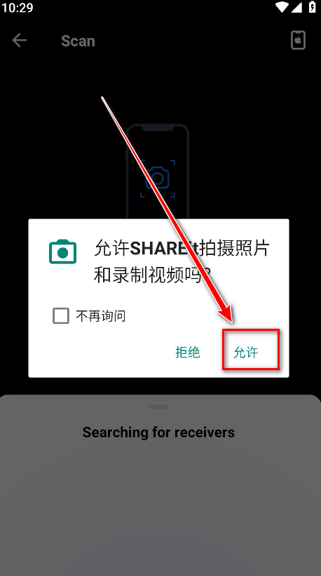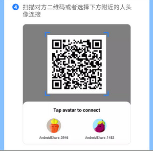 扫描接收方的二维码,或选择附近设备头像建立连接。