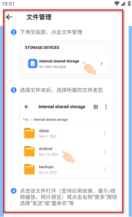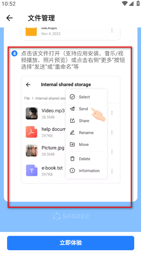 3.点击该文件打开(支持应用安装、音乐/视频播放、照片预览)或点击右侧"更多"按钮选择“发送”或“重命名”等。