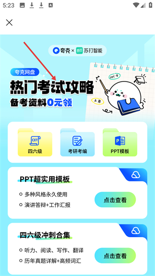 4、联合夸克推热门考试攻略,备考资料0元领,含四六级、考研考编等资源,还有四六级冲刺合集,助力学生备考。