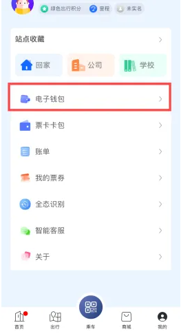 1.登录“南宁轨道交通APP”,点击右下角“我的”—“电子钱包”。