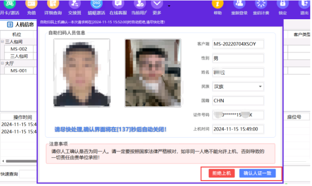 如下图,扫码上机时人证比对失败,这时候“旺旺宝”APP会提示“请联系吧台工作人员为您人工审核”(下图三),这种情况需要吧台收银员在收银台上人工确认“ 上网人员和身份证照片”是否为同一个人(下图四),如果人工确认确实为同一人,请点击“确认人证一致”即可,收银台确认完成后,网民即可上机。如人证不一致请“拒绝上机”。(注意:确认等待时间为3分钟,超过3分钟则需要重新提交认证信息)